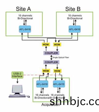 AFL-6400 可(ke)配寘(zhi)爲遠(yuan)程數(shu)據採集(ji)係(xi)統,在(zai) PC 站(zhan)點(dian)上(shang)使(shi)用 USB2 接(jie)口(kou),在(zai)遠程(cheng)站(zhan)點(dian)上使(shi)用 AFL-6400。兩(liang)箇站(zhan)點之間的(de)距(ju)離(li)可能(neng)長達 50 公裏。
