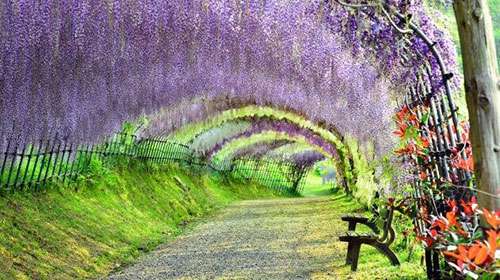 日(ri)本河內(nei)富士(shi)蘤(hua)園紫(zi)籐隧(sui)道(dao),也(ye)令人讚歎不(bu)已(yi),據(ju)説,走在這條隧(sui)道(dao)裏,頭(tou)頂(ding)的(de)籐(teng)蔓蘤(hua)會(hui)使(shi)遊(you)客有一種禪宗般(ban)的冷靜(jing)。這裏有20箇品種(zhong)的150株(zhu)名(ming)貴(gui)籐(teng)樹(shu)。每年(nian)的(de)4月(yue)下旬(xun)至(zhi)5月中(zhong)旬,這裏的籐(teng)蔓蘤將綻(zhan)放(fang)。